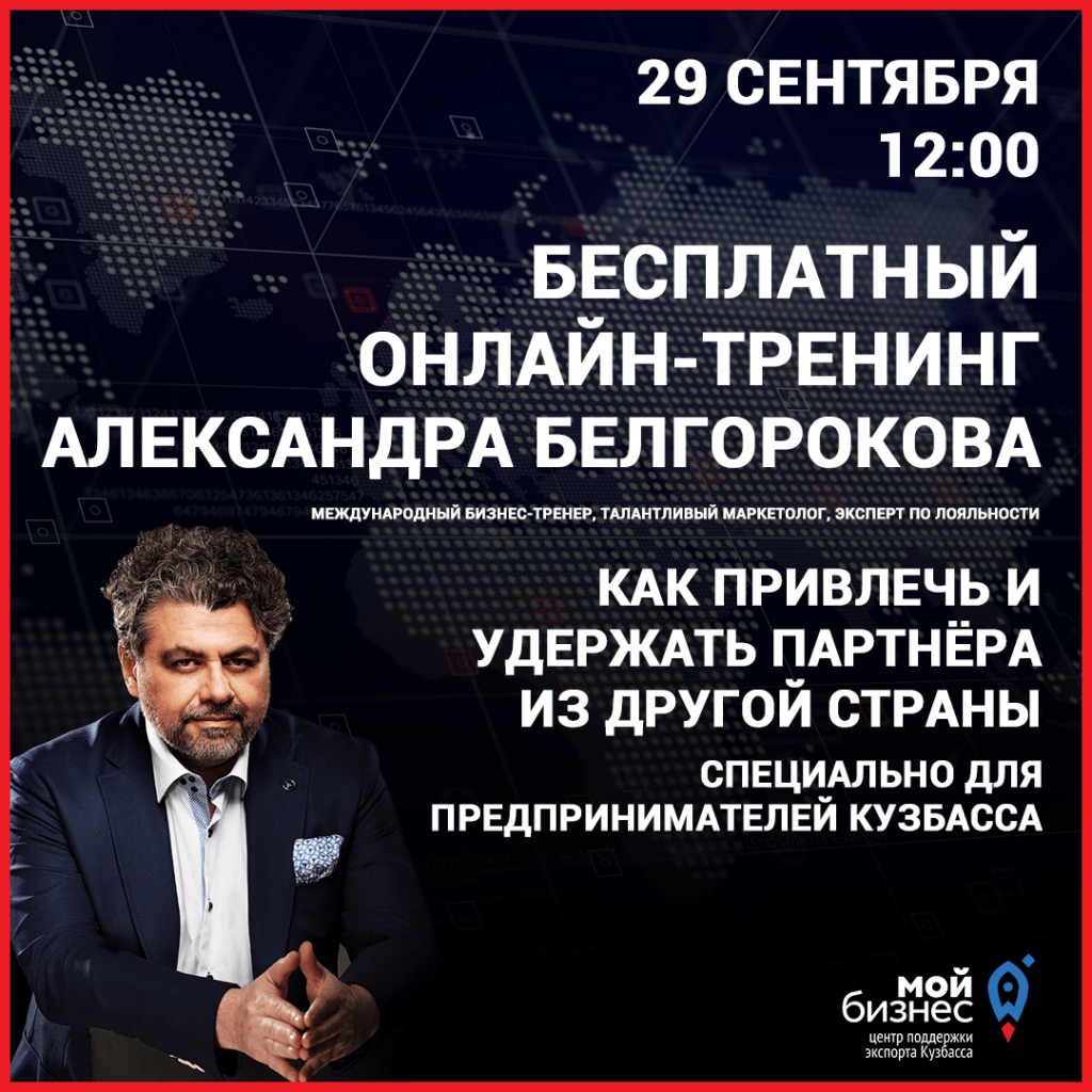 29 сентября на финальном мероприятии конкурса «Экспортёр года» в Кузбассе, который пройдет в online-режиме, для предпринимателей региона пройдет бесплатный тренинг «Как привлечь и удержать партнёра из другой страны».